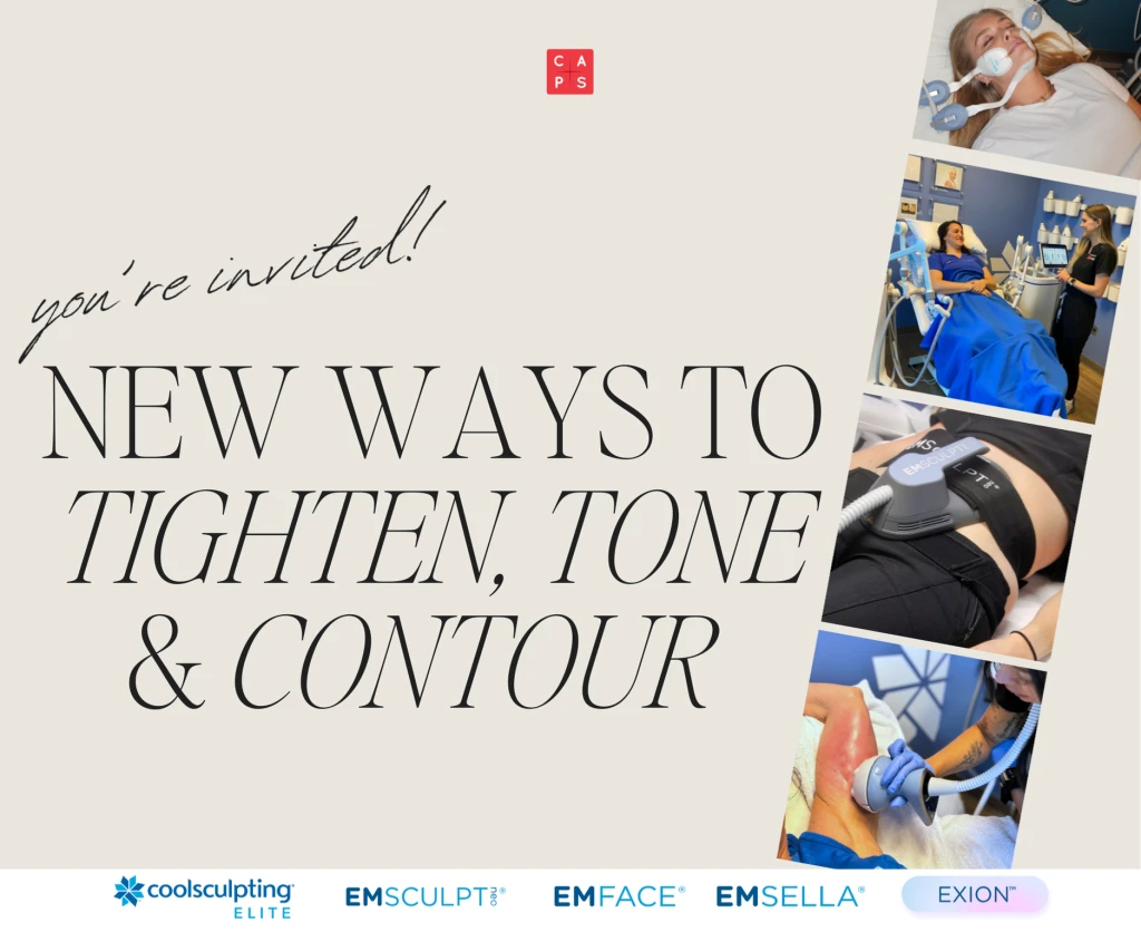 Join us October 8–9 for CAPS’ exclusive Body Contouring Event, where you’ll enjoy a private 45-minute consultation with our expert providers. Discover the latest non-surgical treatments for tightening skin, reducing stubborn fat, enhancing muscle tone, and rejuvenation—including Emface, EXION Microneedling, CoolSculpting Elite, Emsculpt NEO, Emfemme, and EmSella—with customized treatment plans designed just for you.